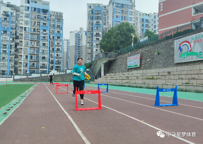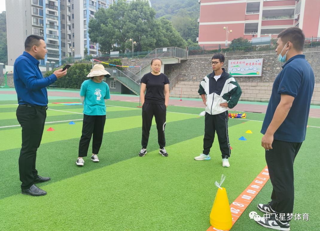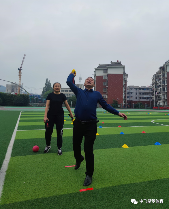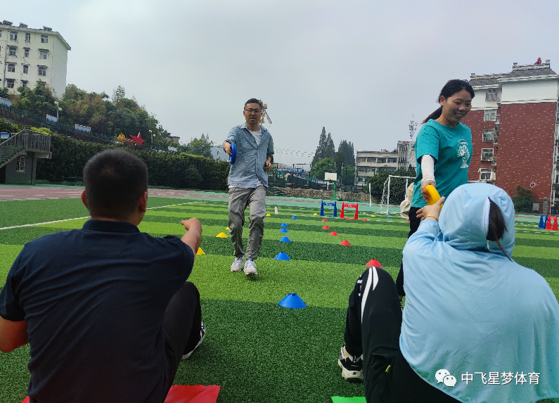 理论学习后,大家开始实践训练。李雪松介绍了趣味田径项目精彩、有趣的实操体验,他以情景化语言,采用合作、竞赛等方式,组织学员进行短跨接力,越过障碍掷准,跪投实心球,十字跳,一级方程式,撑杆跳远,6分钟耐力跑,软式飞盘,速度绳梯等项目。教师们通过合作、竞赛等形式,切身实地的感受到了田径的趣味性、游戏性。