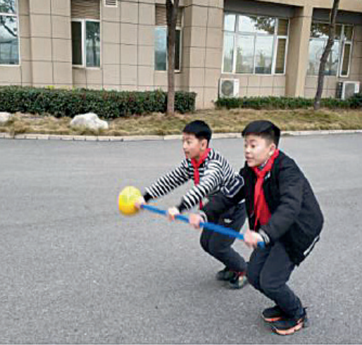 教学方法运用趣味器械“标志杆”,两人一组面向站立,分别托握“标志杆”两端,起跳同时两人上摆双臂,腾空时尽力将“标志杆”上摆举过肩或头,双腿充分蹬地,保证持杆同学顺利通过横置“标志杆”,落地同时双臂控制“标志杆”还原。该教法有助于帮助学生初步建立“蹬地双臂上摆”的协调用力能力(图3)。