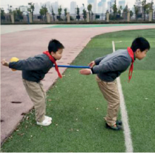 教学建议利用少儿趣味田径器械软式跨栏架,横放间隔0.5m、竖放间隔0.7m的障碍,中间一人连续跳过栏架格,随着左、右同伴的提示及牵引,中间练习的学生上下肢、身体两侧都得以充分的、有序的跳跃能力培养。而两侧学生在合作的练习中,在非限制一侧身体肌肉与被限制一侧身体肌肉的交错刺激下,对这次练习的节奏、力度、幅度有更深程度的动作体验。这样的合作练习中,因为三个人的不同身体体验,带给合作练习的伙伴不同协调能力的提升。