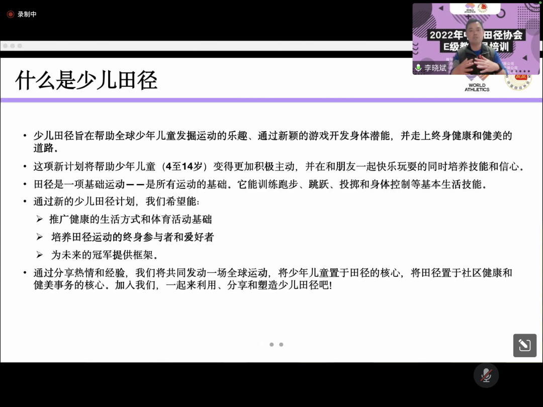 11月12日为线上理论课,由世界田联少儿田径讲师,田径*********裁判,中国田径协会E级教练员讲师李晓斌老师对培训学员进行了理论课教学。