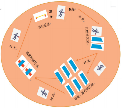 游戏方法一级方程式赛跑是国际田联一项少儿田径项目,是由平跑、跨栏跑和绕杆跑组成的接力跑。游戏“赤道大救援”以此为基础,并利用软式跨栏架和彩色四叠垫的组合,增加了钻爬项目。教师提前摆放好标志杆、彩色四叠垫、软式跨栏架等器材(图2)。学生手持接力环先后进行跨低栏架、跨高栏架、钻爬跨栏架,之后绕标志杆跑,将接力环放置于最后一根标志杆上结束,以完成速度快者为胜(图3~图5)