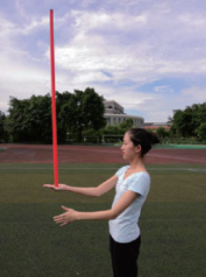 练习方法:单人练习时,通过手臂和手指的配合,控制标志杆在手臂上来回滚动。双人练习时,两人手拉手,面对面站立,通过协作使标志杆在两人的手臂之间来回滚动,并尽量保持更长时间(图5)。