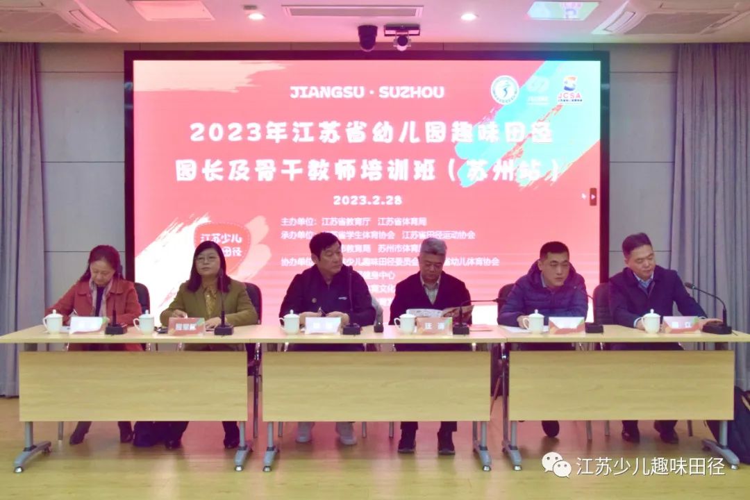 为响应江苏省委办公厅、江苏省政府办公厅印发的《关于全面加强和改进新时代学校体育工作实施意见的通知》,将“学前教育阶段广泛开展趣味田径幼儿体适能游戏活动”列为重点任务,贯彻落实《省教育厅省体育局关于推广少儿趣味田径运动项目的通知》,综合施策建好师资队伍,切实提高教师的专业知识和执教能力。2月28日,江苏省幼儿园趣味田径园长及骨干教师培训班(苏州站)在苏州市教师发展学院举办。江苏省社会体育管理中心主任、江苏省田径运动协会会长 孙谦;江苏田协少儿趣味田径委员会主任、江苏省幼儿体育协会副会长兼秘书长 姜迪;江苏省教育厅体卫艺处主任科员李扬;苏州市体育局副局长程军红;苏州市教育局四级调研员汪涛出席开班仪式。此次培训由苏州市教育局体育卫生与艺术教育处处长姚立主持。