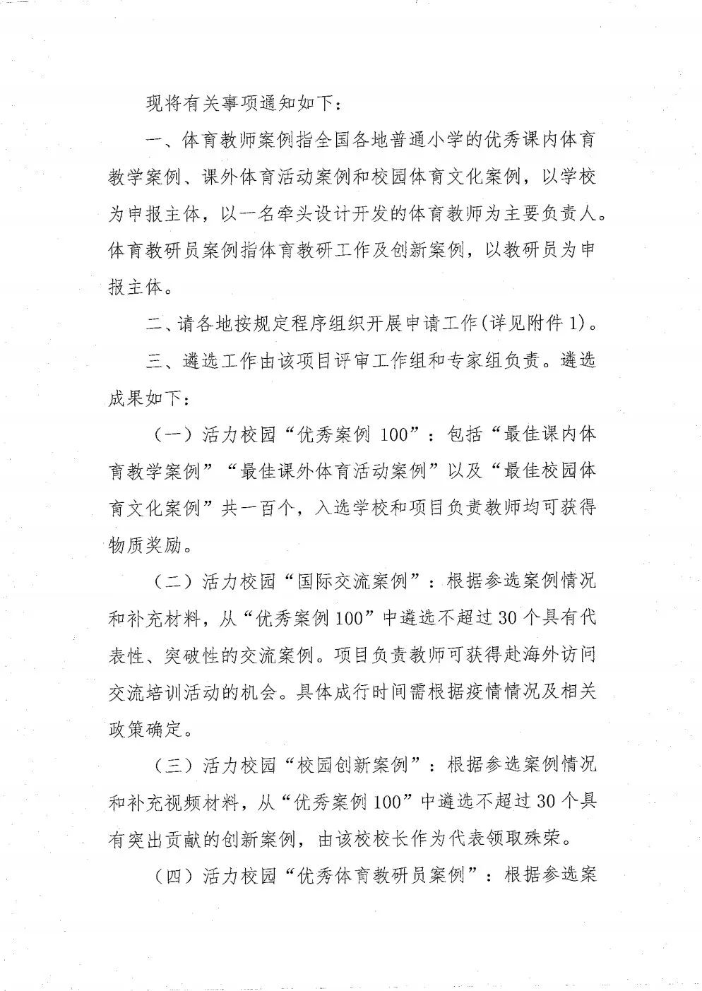 包括体育大课间活动(30分钟以上)、课外体育活动(利用学生课余时间参与的,以锻炼身体、愉悦身心为目的的体育活动。亦包括体育教师在双休日、寒暑假、节假日组织的集体或单项体育活动)、学校体育特色活动、体育特色赛事等创新案例以及家庭体育作业等。同时关注体育与其他学科结合,如体育与艺术、民族、民间文化的结合等。申报案例应着重展现创新性、趣味性,并能吸引师生广泛参与。