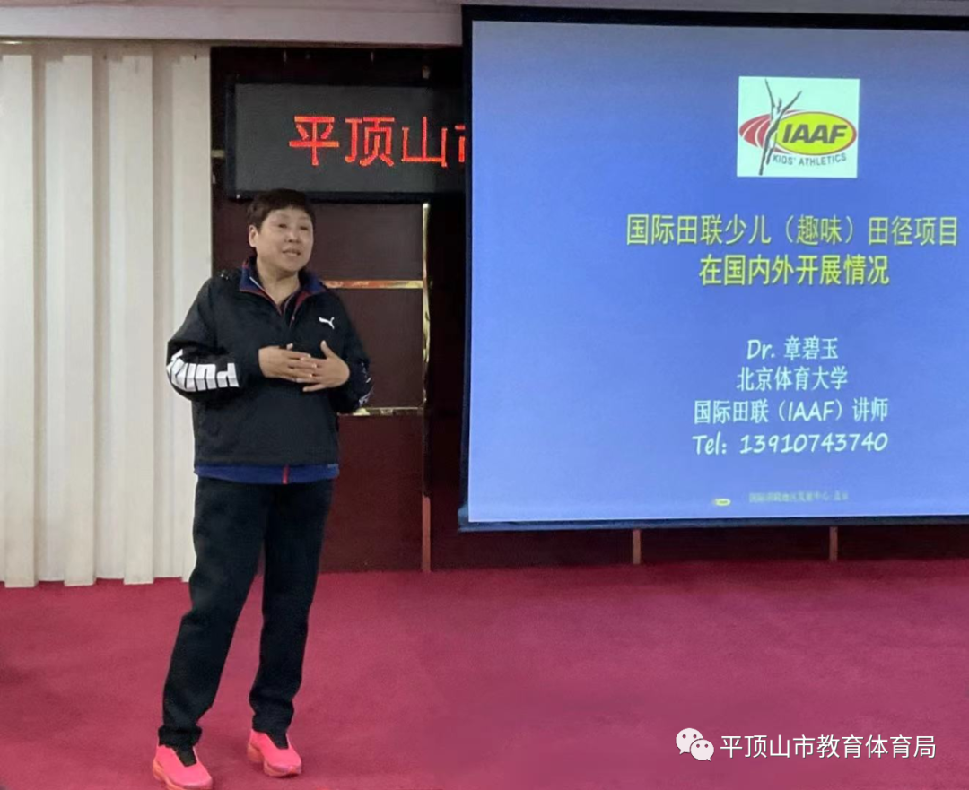 北京体育大学教育学博士、博士生导师章碧玉教授分别通过理论教学和实操演练两个环节对参培人员进行专项培训。以“室内+室外”“理论+实践”并行的授课方式,将少儿趣味田径与实战案例相结合,为学员介绍执教的理念与方法。此次课程内容丰富,涵盖了少儿趣味田径项目活动形式和竞赛规则,少儿趣味田径器材的多样化创意与运用等多项内容。