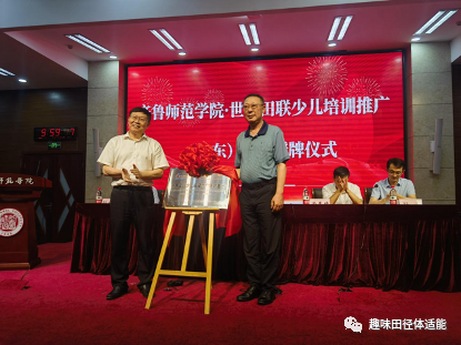 仪式上,世界田联地区发展中心主任孙南表示,少儿田径是世界田联为挖掘幼儿潜质,培养幼儿运动兴趣而诞生的现代体育教学内容,鼓励教师们以“兴趣”为核心,全面学习先进的体育教学理念内容,不断提高教学水平林松柏校长与孙南主任为世界田联少儿田径(山东)培训推广基地揭牌;