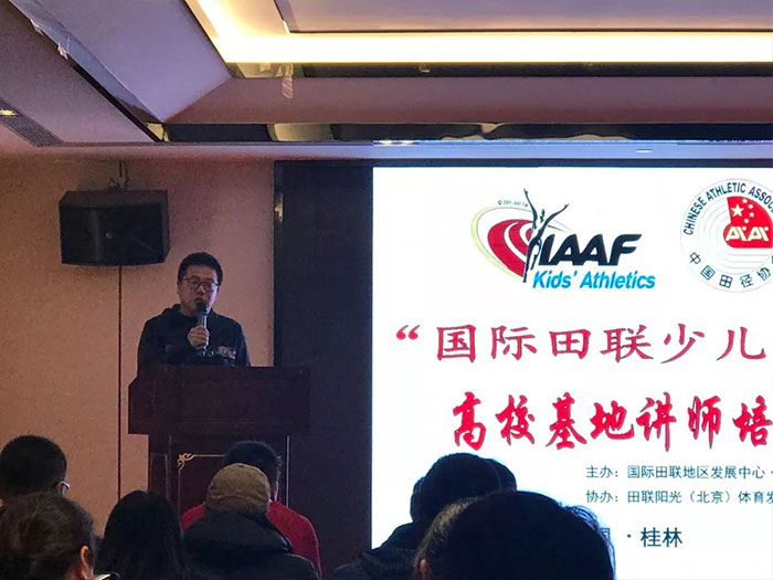 2018年12月22-24日,“国际田联少儿田径”高校基地讲师培训班在广西桂林成功举办。这次培训是为了更好地发挥“国际田联少儿田径推广基地”的作用,满足各基地在推广“少儿田径”过程中的师资需求,经国际田联和亚田联批准,由国际田联地区发展中心·北京和中国田径协会主办,由田联阳光(北京)体育发展有限公司协办。来自全国30多所高校的50名体育专家老师参加了此次培训。国际田联地区发展中心·北京的孙南主任和田联阳光(北京)体育发展有限公司的总经理高永强先生出席了此次活动。孙南主任和高总分别代表主办方和协办方进行了致辞。