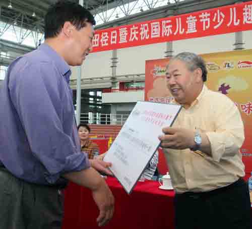 国际田联荣誉副主席楼大鹏先生为5支参赛队颁发国际田联少儿趣味田径标准器械
