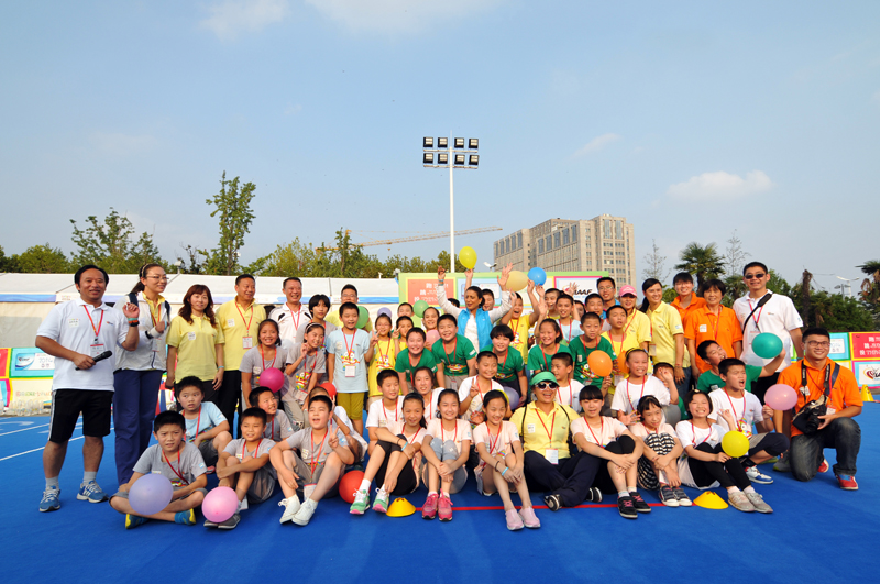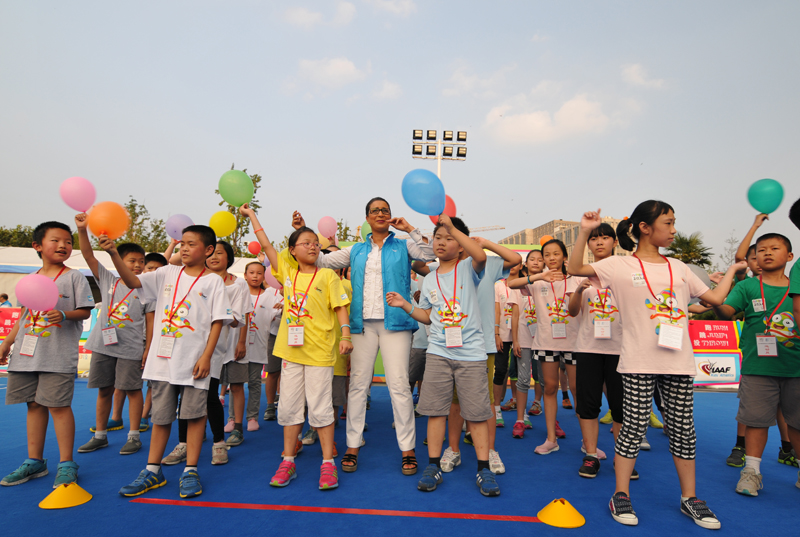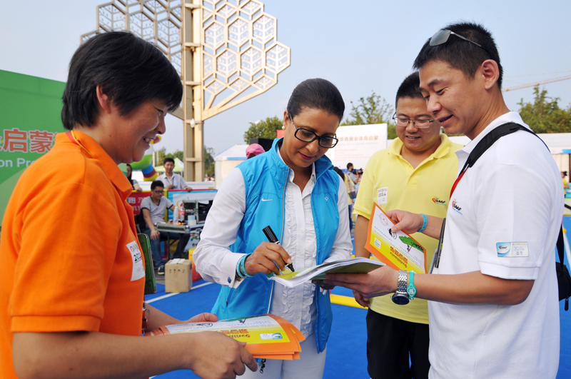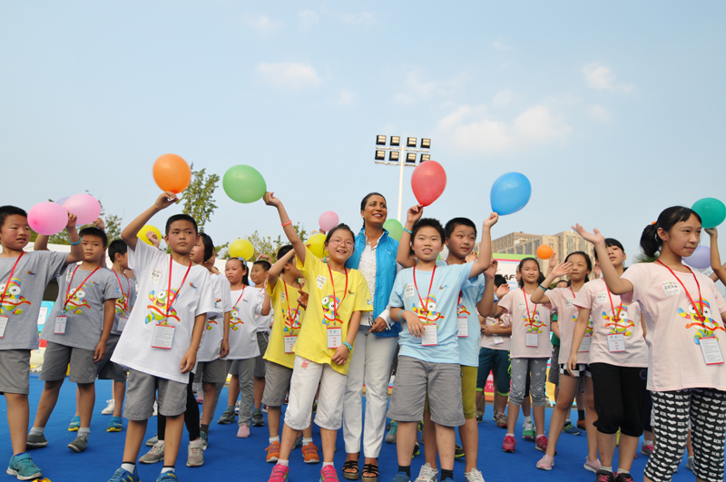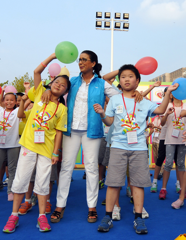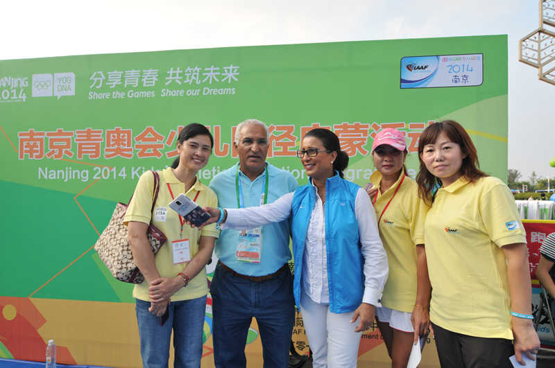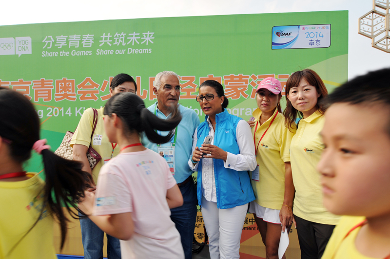 8月21日下午,河西万达广场南京青奥会少儿田径启蒙活动进行的如火如荼,小运动员们有的在跨栏,有的在接力,有的在撑杆跳,有的在掷标枪等。5时许,国际奥委会第一副主席纳瓦尔·埃尔·穆塔瓦基尔(Nawal El Moutawakel),1984年洛杉矶奥运会女子400米栏金牌得主,在国际田联官员的陪同下来到孩子们中间,与他们亲切交流合影留念,令孩子们开心不已。她还应邀在《我为青奥代言》上留言:“祝年轻运动员好运,感谢南京”并签名。