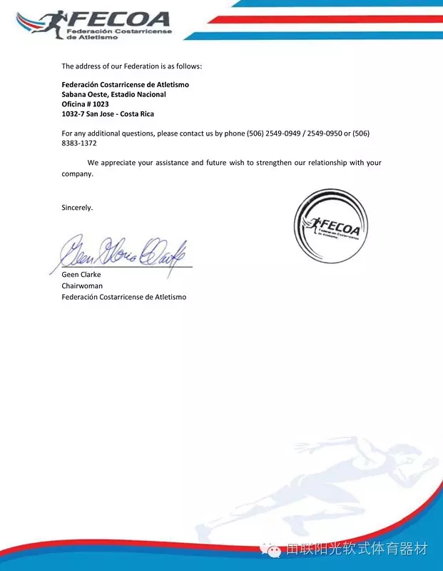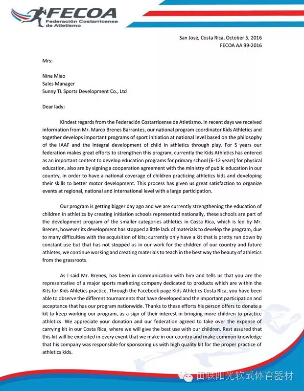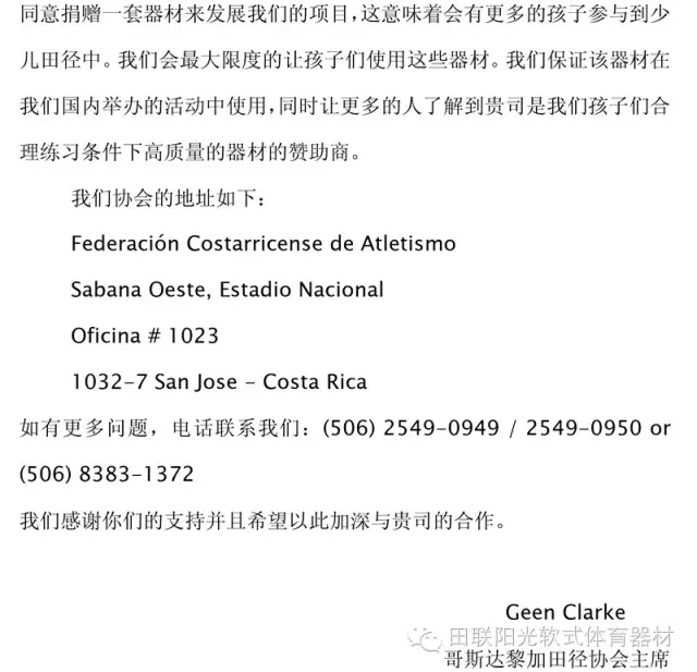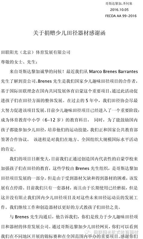 近日,田联阳光(北京)体育发展有限公司收到了来自拉丁美洲哥斯达黎加共和国田径协会主席Geen Clarke的一封感谢函,函中,Geen Clarke主席对田联阳光捐赠体育器材的义举深表感谢,表示该器材的推广使用对哥斯达黎加少儿田径项目的发展工作发挥了重要的助推作用,希望以此为契机加深拓宽双方今后的商业合作。