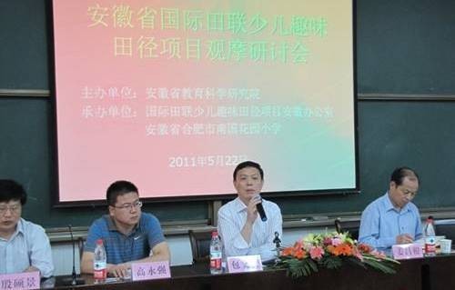 2011年5月22日上午,“国际田联少儿趣味田径项目观摩研讨会”在安徽省首批“国际田联少儿趣味田径实验学校”合肥市庐阳区南国花园小学胜利召开,参加会议的有安徽省教育科学研究院副院长包文敏、国际田联地区发展中心·北京青少部主任高永强、合肥市教育局副局长姜昌根、安徽省教科院体卫艺处主任江玲、庐阳区教育体育局副局长殷硕景在主席台就座,各市、县(区)的上百位教研员、学校校长和体育教师参会,共同探讨如何开展“国际田联少儿趣味田径目”。南国花园小学的教师和学生为与会领导和教师展示了少儿趣味田径项目生动有趣的体