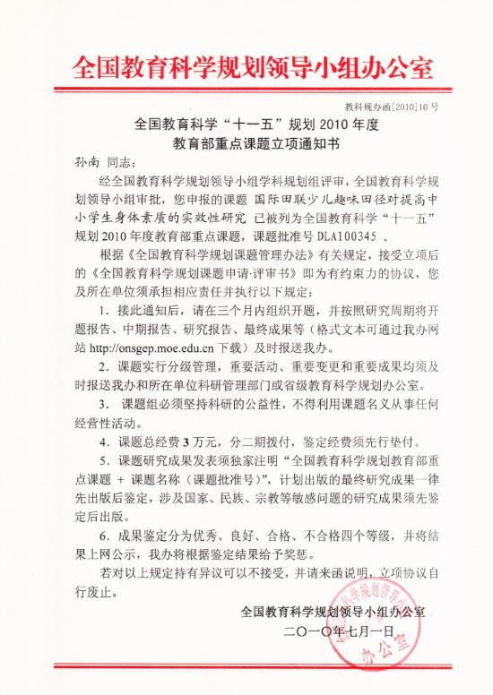 由北京体育大学教授、国际田联地区发展中心·北京副主任孙南教授承担的,关于少儿趣味田径研究方面的课题:“国际田联少儿趣味田径对提高中小学生身体素质的实效性研究”已经于2010年7月被全国教育科学规划领导小组办公室立项为全国教育科学“十一五”规划教育部2010年度重点课题,课题批准号:DLA100345。