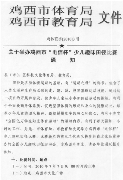 关于举办鸡西市“电信杯”少儿趣味田径比赛通知