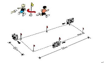 器材的放置如上图所示。每队要有两条跑道,只在一条跑道上放置栏架,另一条跑道不放栏架。每队的第一棒是跨栏跑,第二棒队员接力后短跑。当各队的队员都分别完成了跨栏跑与短跑后(既每个运动员都要完成短跑与跨栏跑)比赛结束。比赛活动中要求队员左手传棒接力。